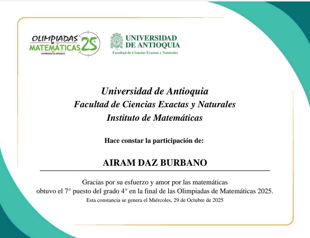 e orgullo y alegría al compartir una gran noticia: la estudiante Airam Díaz Burbano, del grado cuarto, obtuvo el séptimo puesto a nivel nacional en la final de las Olimpiadas de Matemáticas de la Universidad de Antioquia, un logro que demuestra su talento, disciplina y amor por los números.La competencia, que reunió a los mejores jóvenes talentos del país, tuvo lugar en la ciudad de Medellín, donde Airam representó con gran compromiso y entusiasmo a nuestra institución. Aunque solo los cinco primeros puestos clasificaban a una fase internacional en México, el séptimo lugar nacional alcanzado por Airam es motivo de gran orgullo para toda la comunidad educativa.