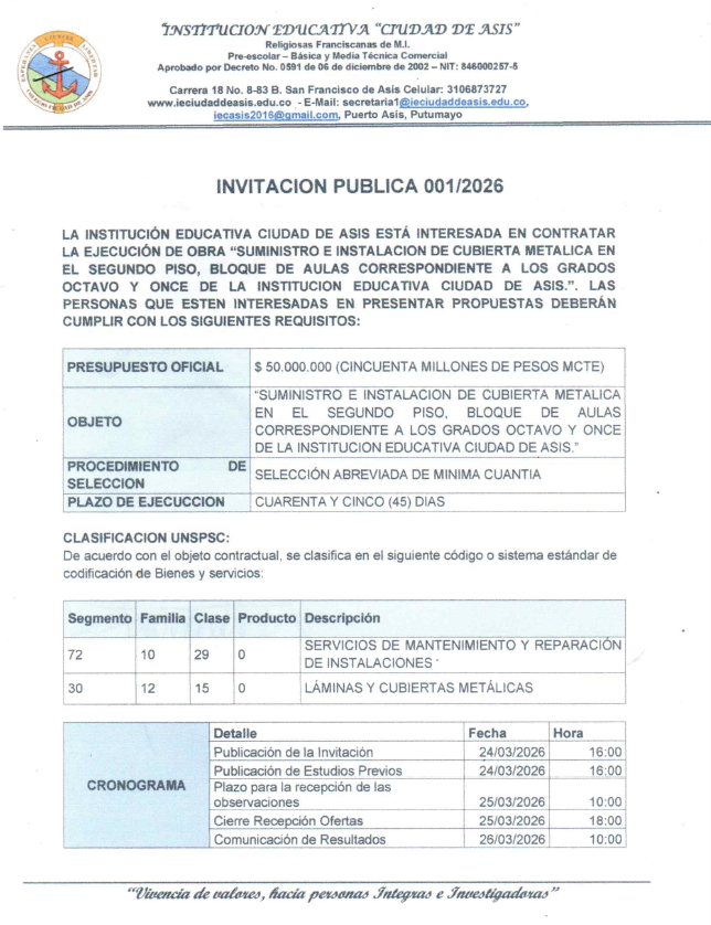 INVITACION PUBLICA 001/2026Publicado el 24 Marzo 2026 | Escrito por Super Usuario | Imprimir | Email | Visitas: 419Descargar INVITACION PUBLICA 001/2026INVITACION PUBLICA 001/2026 TwitterBotonSocial por: Chemadominguez