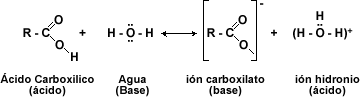 El comportamiento químico de los ácidos carboxílicos esta determinado por el grupo carboxilo -COOH. Esta función consta de un grupo carbonilo (C=O) y de un hidroxilo (-OH). Donde el -OH es el que sufre casi todas las reacciones: pérdida de protón (H+) o reemplazo del grupo –OH por otro grupo.