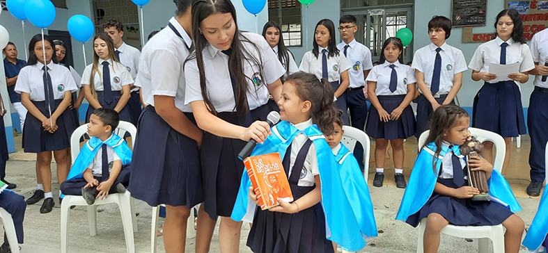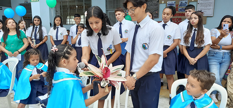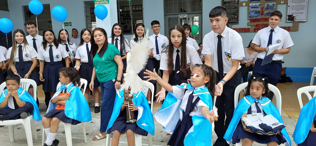 Los docentes directores de grado Once de la Prom 2022, Marcela Rosero, Vianey Insuasty y Fabio Valenzuela, organizaron junto a los estudiantes un programa especial para realizar la entrega de símbolos a los estudiantes de preescolar de nuestra Institución.