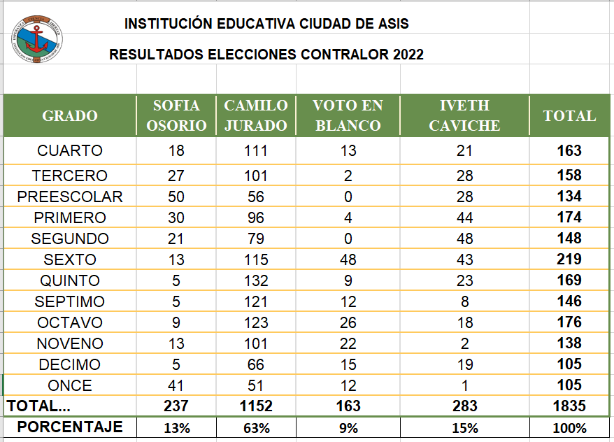 El día 21 de Abril del 2022, se llevó a cabo la elección del Contralor estudiantil, en el marco de la de la elección del Gobierno Escolar de la Institución Educativa Ciudad de Asís. Este evento democrático, fue organizado por el AREA DE CIENCIAS SOCIALES, como práctica del ejercicio de la participación ciudadana, para dar ejemplo de una democracia participativa, transparente y ética política, libre de politiquería y clientelismo.