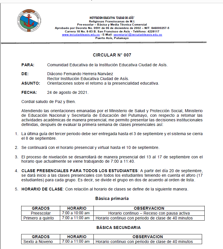 Circular 007 del 24 de agosto de 2021. Clases presenciales para todos los estudiantesPublicado el 24 Agosto 2021 | Escrito por Super Usuario | Imprimir | Email | Visitas: 3465Descargar Circular 007 Circular 007