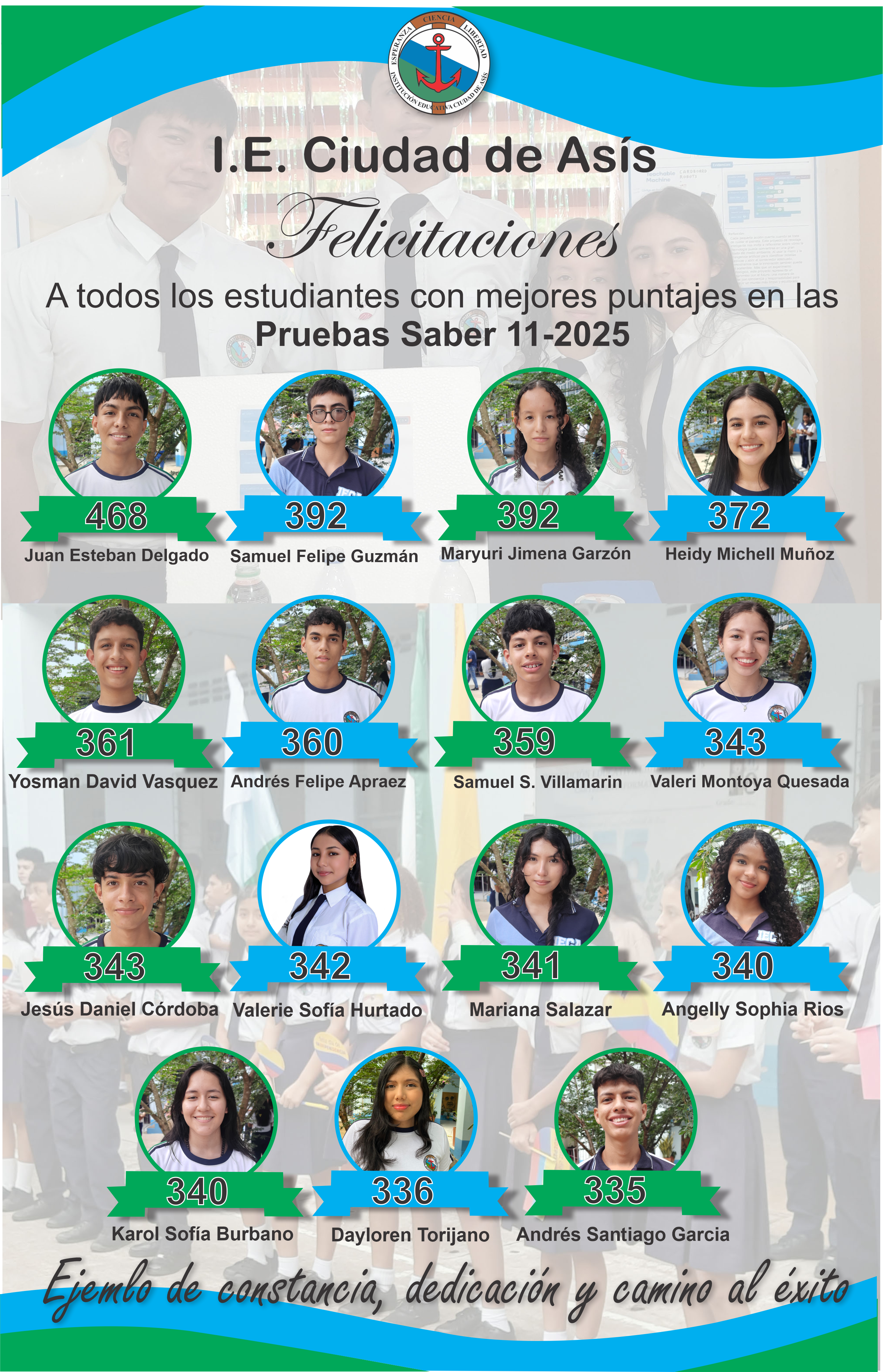 La Institución Educativa Ciudad de Asís expresa un reconocimiento especial a todos los estudiantes de grado 11 por su compromiso y responsabilidad durante el desarrollo de las Pruebas Saber 11. Felicitamos de manera destacada a los 42 estudiantes que alcanzaron puntajes superiores a 300, reflejando su esfuerzo, dedicación y constancia a lo largo del proceso académico.