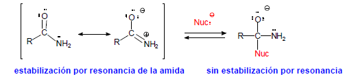 *Por ejemplo: una parte de la estabilización por resonancia de las amidas se pierde cuando el grupo carbonilo resulta atacado por un nucleófilo:
