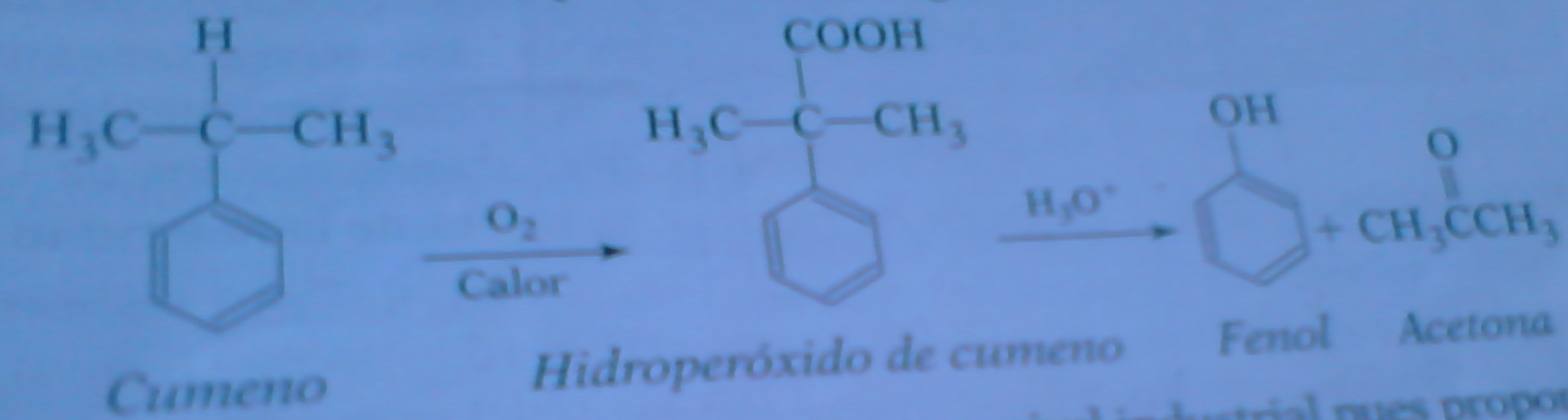 También llamado ISOPROPILBENCENO, reacciona con el oxígeno del aire a alta temperatura, de la siguiente manera: