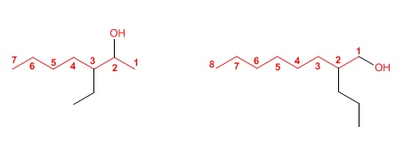 PASO 2: Se enumera la cadena principal para que el grupo OH tenga el localizador mas bajo. El grupo hidroxilo tiene preferencia sobre cadenas carbonadas, halógenos, dobles y triples enlaces.