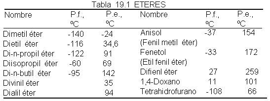 Los éteres presentan un grupo de ebullición inferior de los alcoholes, aunque su solubilidad en agua es similar. Dada su importante estabilidad en medios básicos, se emplean como disolventes inertes en numerosas reacciones.