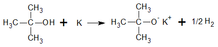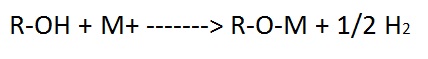 Los alcoholes se comportan como ácidos debiles en presencia de bases fuertes, como en el caso de los metales alcalinos y algunos alcalinotérreos que atraen fuertemente a los protones. Esta reacción da como producto hidrógeno y un compuesto denominado alcóhoxido métalico, los cuales son bases fuertes que por tratamiento con agua generan nuevamente el alcohol original e iones hidróxido.