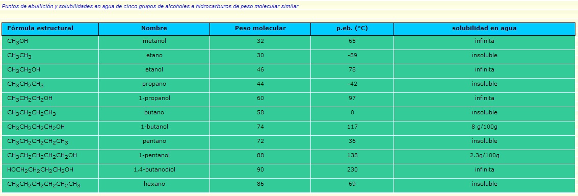 Los puentes de hidrógeno permiten la asociación de moléculas de alcohol, dando así una buena solubilidad en agua, tan solo cuando la cadena del compuesto tiene entre 1 y 4 carbonos, por el contrario, entre más larga es la cadena y más carbonos tiene disminuye su solubilidad.