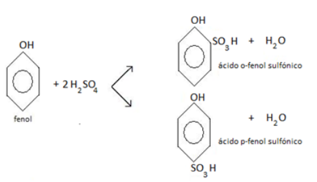 El fenol se puede combinar con el ácido sulfúrico en caliente, dando una mezcla de dos isómeros de ácido O- fenol sulfónico y P- fenol sulfónico.