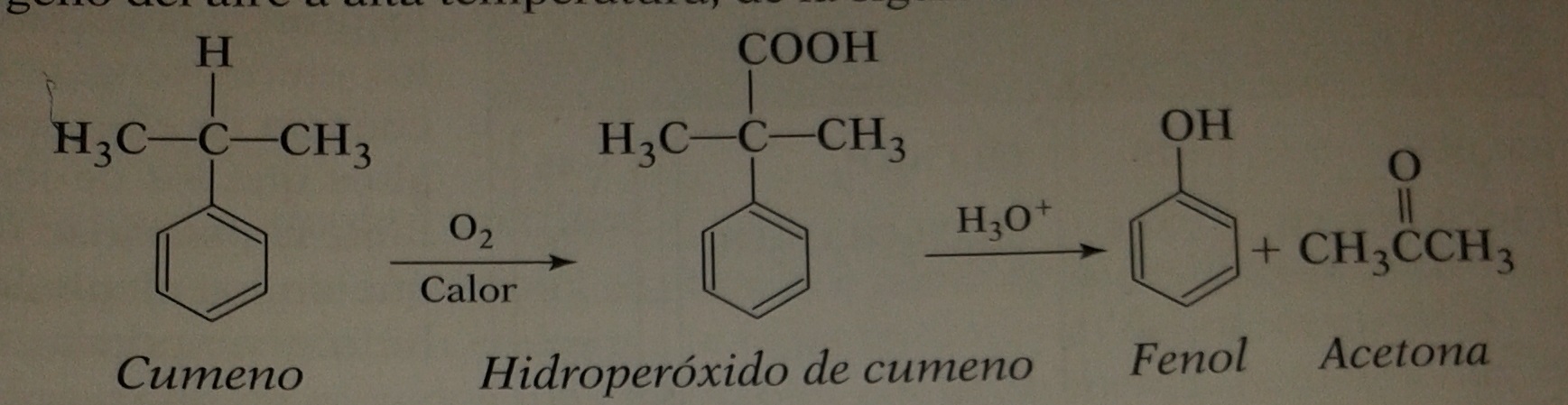 A partir de Cumeno: El Cumeno (isopropilbenceno) hace reacción con el oxígeno del aire a alta temperatura, de la siguiente forma: